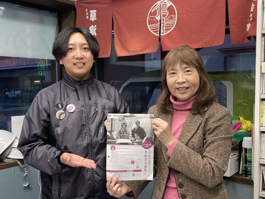 出演者名称および所属草津市観光ボランティアガイド協会 会員 松本知子さん 小西慎一さん聞き手 パーソナリティ&ディレクター 中嶌裕恵 概要 今回は、シリーズ草津観光8コースからHコース「草津宿街道筋屋号看板めぐり」の内容です。草津宿の屋号看... NEWS
