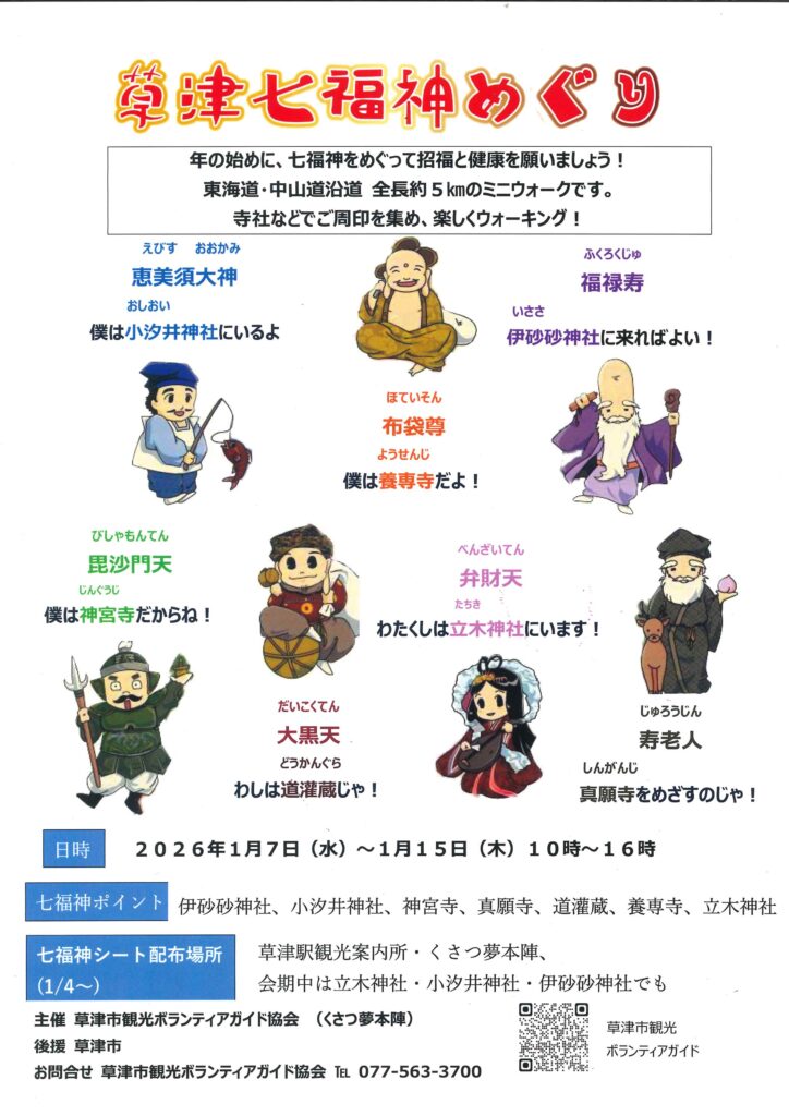来年で「草津市観光ボランテイアガイド協会」も活動スタートから30周年を迎えます。20周年記念事業として企画されて開催されている「七福神めぐり」も市民にしっかり定着し、お正月の開運祈願にご家族やお友達とめぐられます。今回は「七福神めぐり」企画の裏話を会員の中後さんにお話し頂きます。