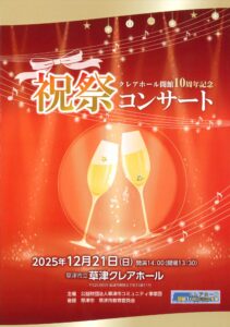 今月の月刊くさつアートセンターは、12月21日に草津クレアホールで行われた「クレアホール開館10周年記念 祝祭コンサート」第2部の模様をお送りします。