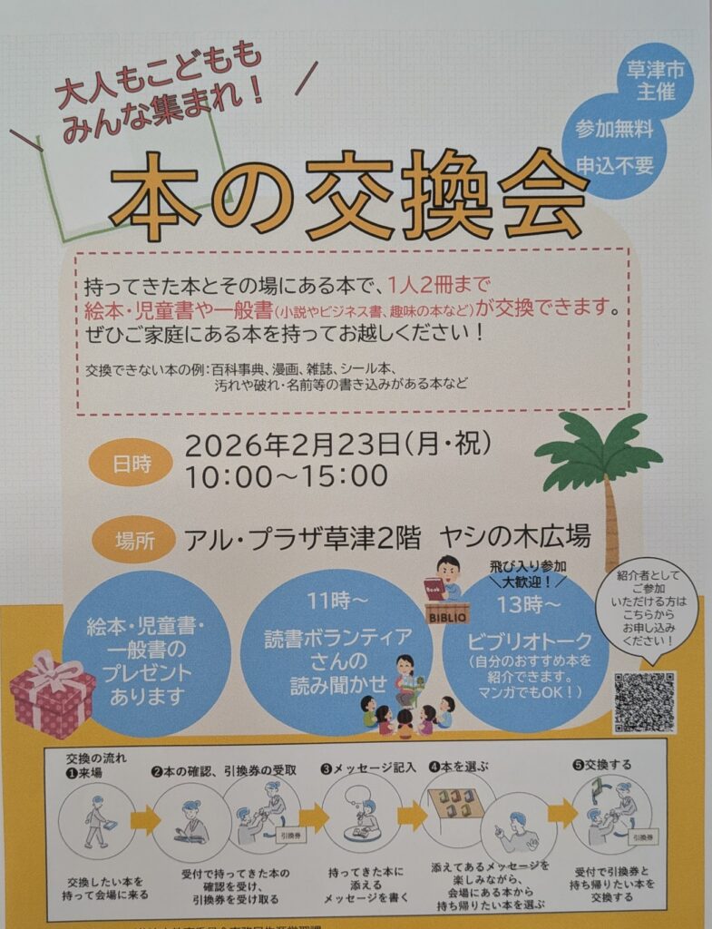 場所:アル・プラザ2階 ヤシの木広場https://www.city.kusatsu.shiga.jp/kosodate/dokusyo/event/0223honnokoukankai.html