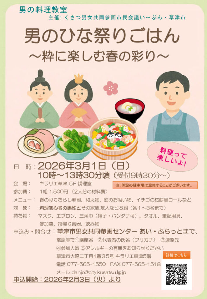 場所:キラリエ草津5階 調理室https://www.city.kusatsu.shiga.jp/kurashi/jinken/danjosankaku/keihatsu/danseiryouri0301.html