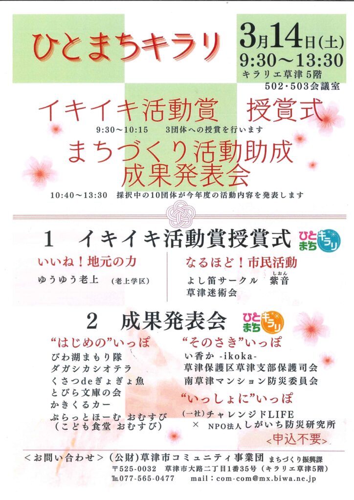 日時:3月14日(土)9:30~13:30迄 キラリエ草津