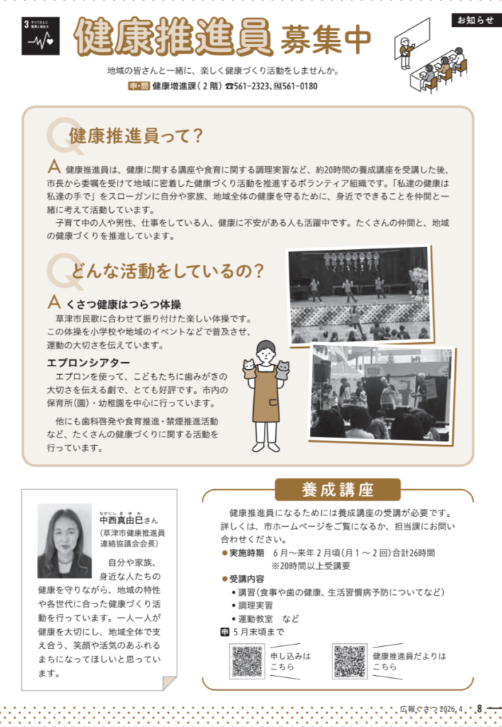 ☆健康推進員の活動ご紹介と養成講座ご案内(広報くさつ4月号8ページ)