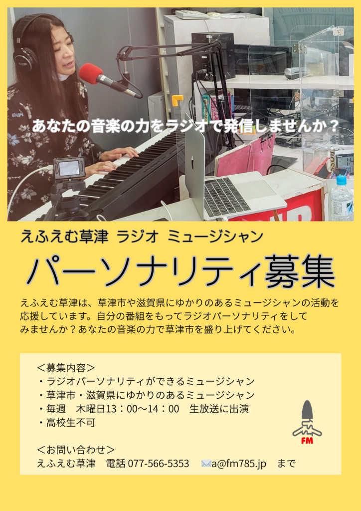 えふえむ草津では、音楽枠のミュージシャンパーソナリティを募集しております。 我こそはっ!という方はえふえむ草津までご連絡をください。 一緒に楽しい番組を作りましょう! NEWS10/13(月)イブニングロケッツ785 放送後記